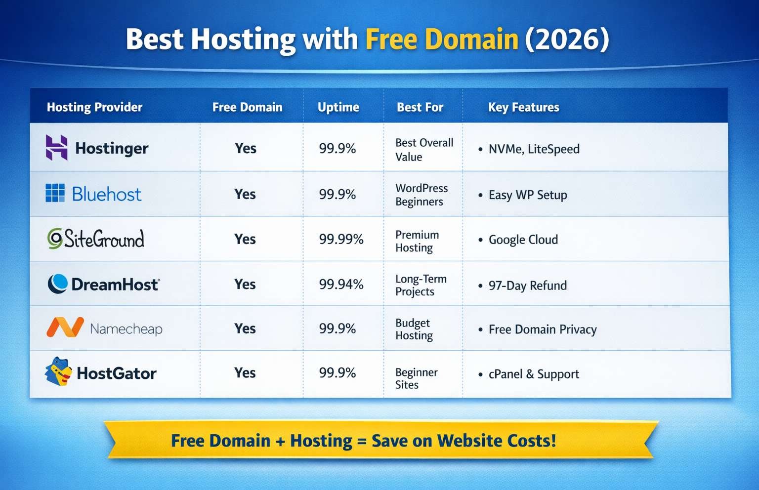 This guide breaks down the best hosting with free domain offers in 2026 β based on performance, uptime, features, pricing, and overall value.